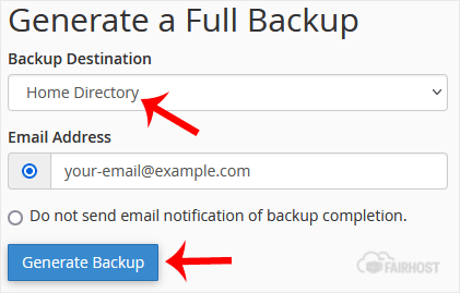 Når cPanel-sikkerhedskopieringen er færdig, vil du modtage en meddelelse. Du kan downloade sikkerhedskopier fra Backup > Download a Full Account Backup.