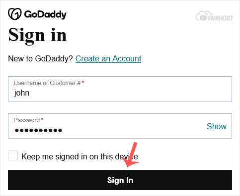 2. Indtast brugernavn eller kunde-ID og adgangskode til din GoDaddy-konto. Klik derefter på Sign In.