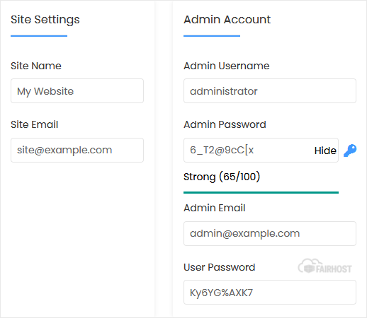 • Admin Username: Dit nye PHP-Fusion-brugernavn (af sikkerhedsmæssige årsager, brug ikke administrator eller admin som brugernavn).