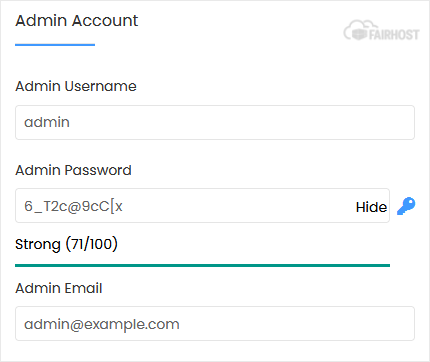 7. Under feltet Admin Account skal du indtaste følgende oplysninger: