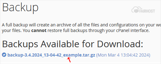 Når cPanel-sikkerhedskopieringen er færdig, vil du modtage en meddelelse. Du kan downloade sikkerhedskopier fra Backup > Download a Full Account Backup.