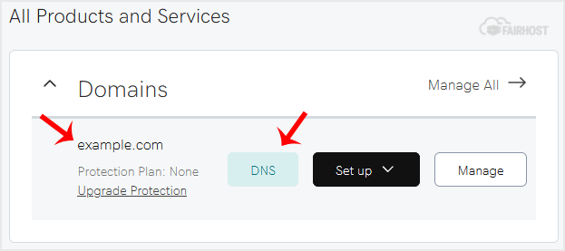 3. Under sektionen Domains, klik på DNS ved siden af det domæne, du ønsker at administrere.