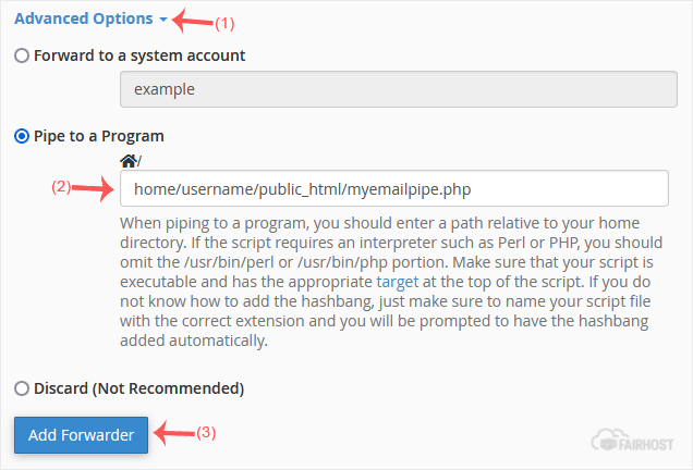 3. I sektionen Destination skal du klikke på Advanced Options, vælge Pipe to a Program og indtaste den fulde sti til dit pipe-script, såsom home/username/public_html/myemailpipe.php. Bemærk, at vi ikke bruger en skråstreg i begyndelsen af URL'en.
