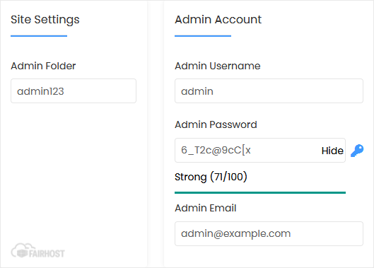 • Admin Folder: Indtast navnet på din admin-mappe, f.eks. admin123.