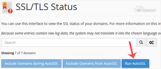 Hvis den viser nogen fejl, så prøv at rette dem eller åbn en billet hos os. Hvis den ikke viser fejl, betyder det, at AutoSSL ikke automatisk inkluderede dit domæne. Det vil hjælpe, hvis du tvinger cPanel til at køre en AutoSSL på dit domæne og installere et SSL-certifikat. Du kan køre AutoSSL på dit domæne på følgende måde: